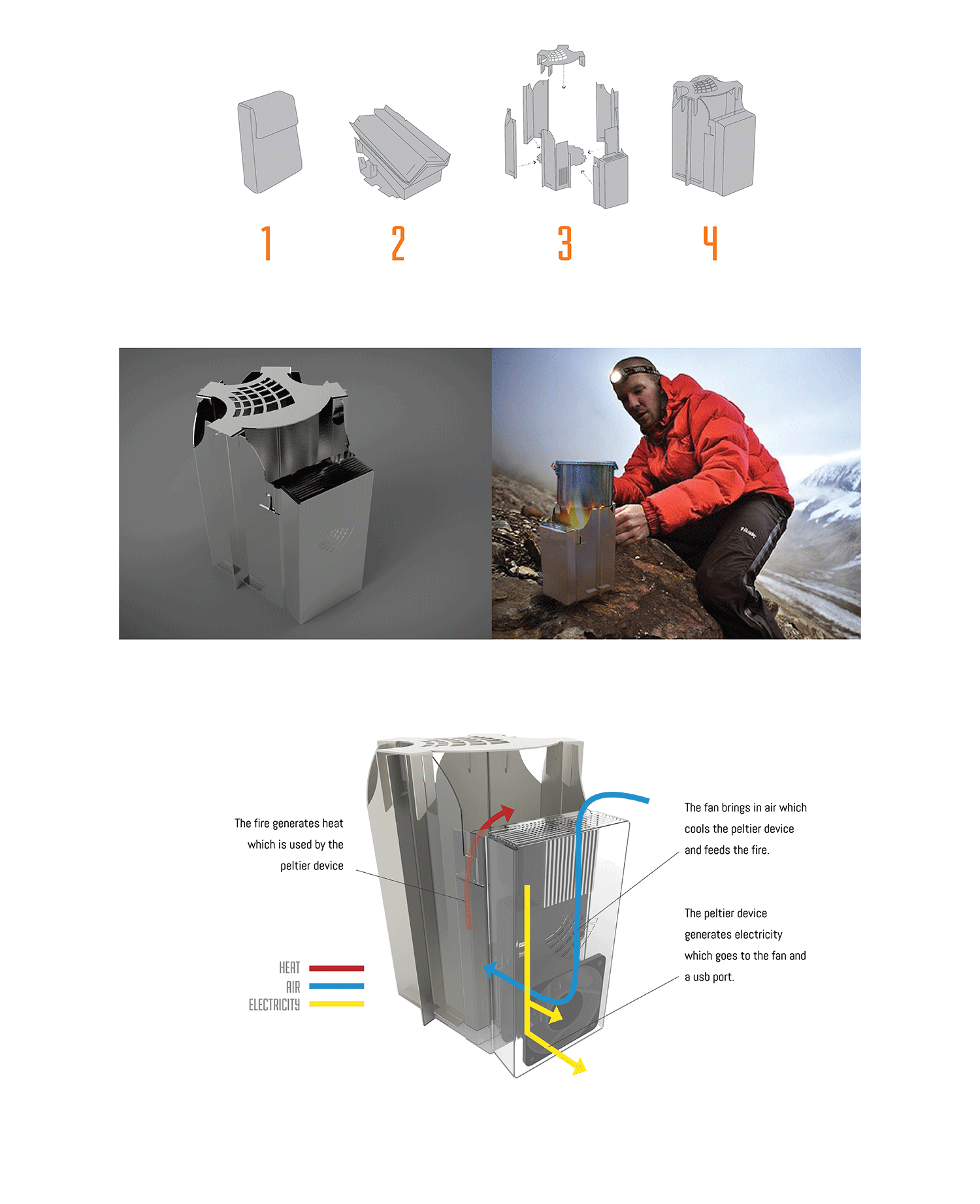 The Peltier is a wood burning camp stove that uses a peltier device to generate electricity from the heat of the fire. The electricity runs a fan that adds more oxygen to the fire. Any excess power is routed to a USB port which can be used to charge your electronic devices.